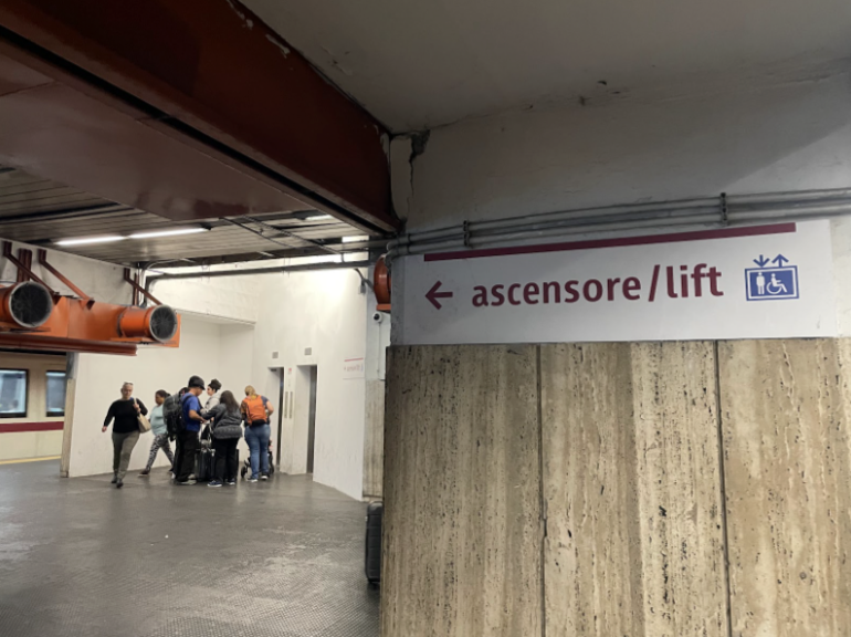 Dall’uscita degli ascensori, si prosegue dritto per circa 40 metri fino ai tornelli, dove è disponibile un varco dedicato alle sedie a rotelle, situato immediatamente a sinistra.