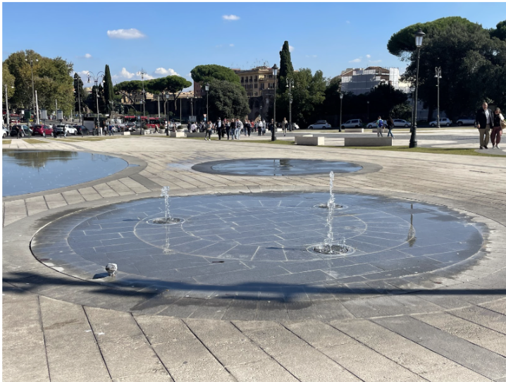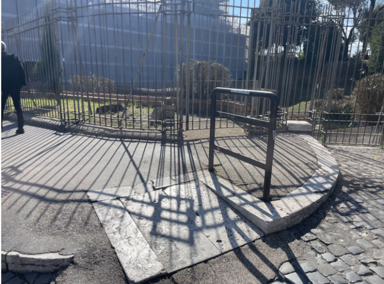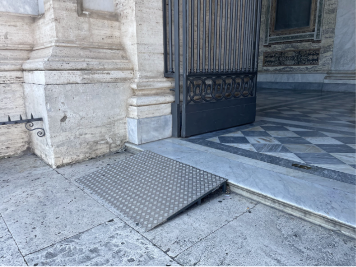 Dal punto di sosta al varco di sicurezza l’area è ampia e priva di dislivelli significativi. Il piazzale presenta tratti in pietra liscia, zone erbose e piastrelle in cemento, con presenza di fontane a sfioro a destra e sinistra della facciata. L’ingresso è dotato di rampa.